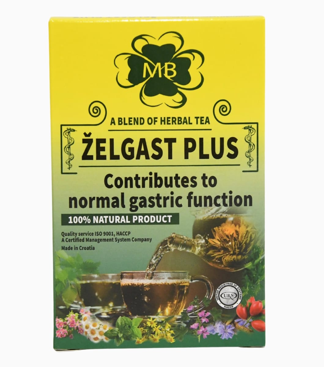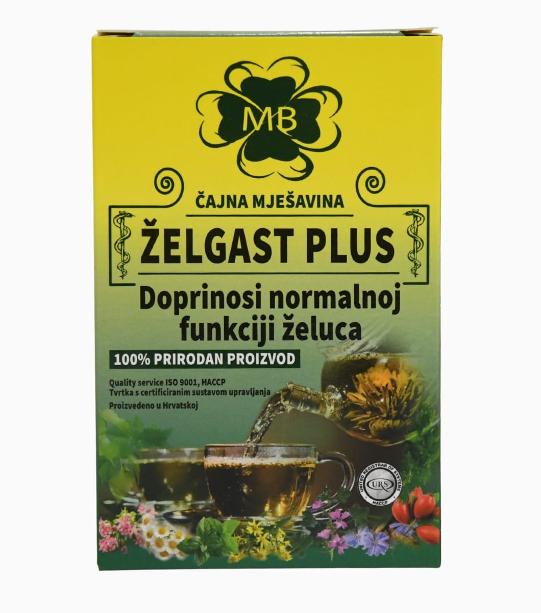 - Neki od sastojaka u Želgast plus čajnoj mješavini su – korijen maslačka, list paprene metvice, zelen štitaste kičice, zelen stolisnika i drugi. Ove biljke, narodna medicina i racionalna fitoterapija, opisuju kao izvrsnu pomoć kod gastritisa (upale želučane sluznice) i gerba (gastroezofagealne refluksne bolesti – patološkog stanja vraćanja želučanog sadržaja iz želuca u jednjak, pri čemu dolazi do erozije (propadanja, oštećenja) sluznice jednjaka i usne šupljine i dr.).
