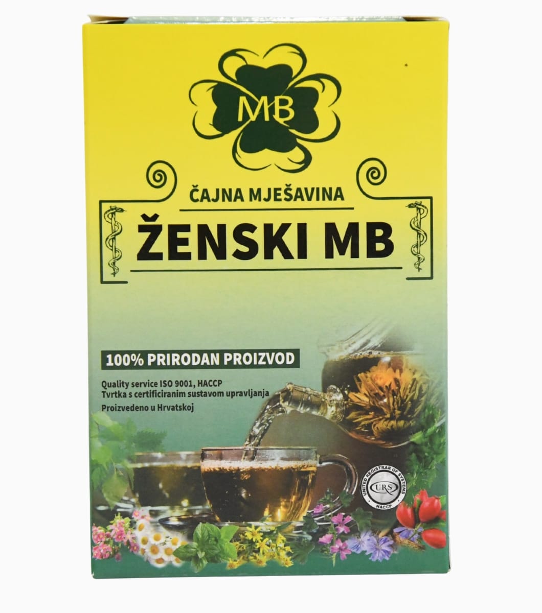 - Neki od sastojaka u Ženski MB čajnoj mješavini su – zelen vrkute, zelen rusomače, cvijet nevena i drugi. Ove biljke, narodna medicina i racionalna fitoterapija, opisuju kao savršen spoj koji doprinosi smanjenju bolova, grčeva, mučnine, napetosti, nadutosti prije i tijekom menstruacije. Ove biljke karakteriziraju i druga svojstva poput regulacije menstrualnog ciklusa i smanjenja upale jajnika.